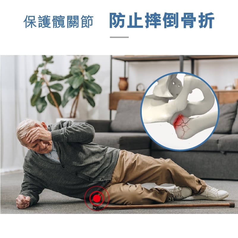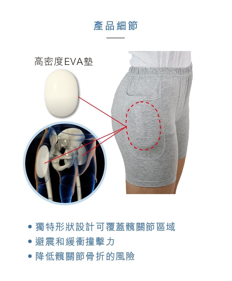 - Pants-shaped with shock-absorbing plastic pads on both sides of the hip joint