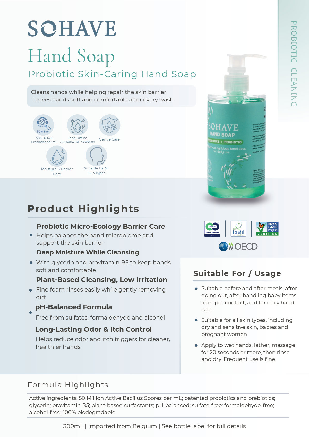 * Active Ingredients (Belgium): EU compliant; Sodium Laureth Sulfate; PEG-6 Caprylic/Capric Glycerides; Probiotic Ferment