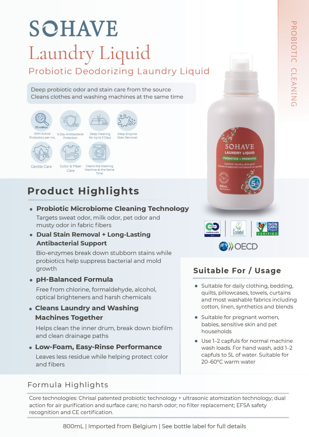 SOHAVE (So Nice To Have) was born from deep research into probiotics and a passion for sustainable living. It is the world’s first Belgian probiotic-powered cleaning range. The brand combines science and eco-friendliness to deliver safe, effective, and planet-friendly cleaning solutions for a healthier lifestyle.