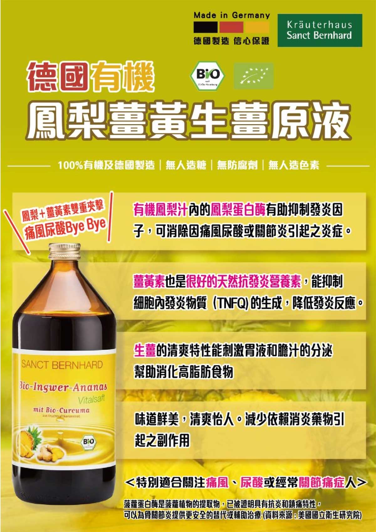 Sanct Bernhard 德國有機鳳梨薑黃生薑原液500毫升 | 100%純有機果汁| 無添加糖及水份 | 德國製造
